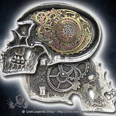Latin, meaning \'mechanised life to come\'; the future of the human race. Pewter cross-section of a human skull, showing brass and copper internal components.