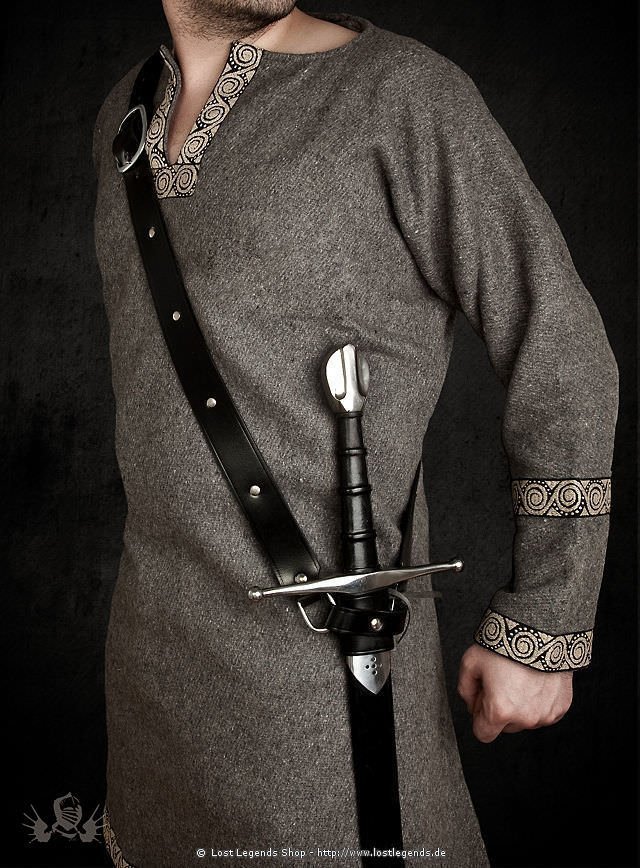 Dieser breite Lederriemen wird quer über die Schulter getragen, so dass die Waffe an der Seite immer "bei Hand" ist. Dieses Bandelier ist aus schwarzem Leder, das mit Nieten beschlagen ist. Die Schlaufe für die Scheide lässt sich an die meisten Schwertgrößen anpassen.