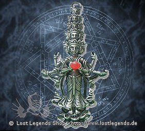 Der Erzählung nach schwor Avalokiteshvara ein Gelübde nicht eher zu ruhen, bis er alle Lebewesen vom Leiden befreit hätte. Als er das ungeheure Ausmaß der Aufgabe begriff, wurde er mutlos und sein Kopf zersprang in tausend Stücke. Buddha Amitabha fügte die Stücke zu einem Körper mit elf Köpfen zusammen und half ihm damit, das Leiden leichter zu sehen.