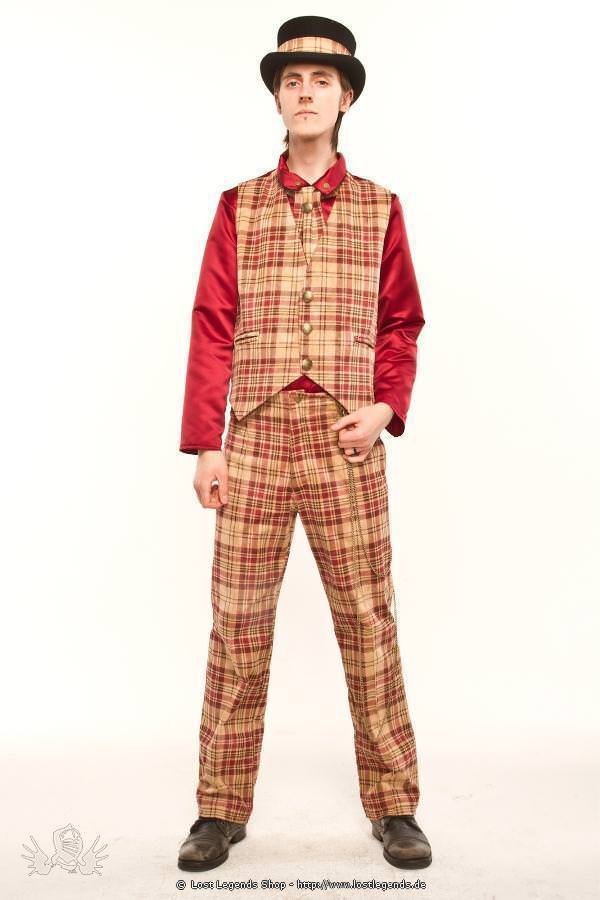 Mens Steampunk collarless waistcoat made from a hard wearing wine/cream check cord fabric. It has two lined jetted pockets on the front, fastens with three antique style brass buttons and an all wine satin back.