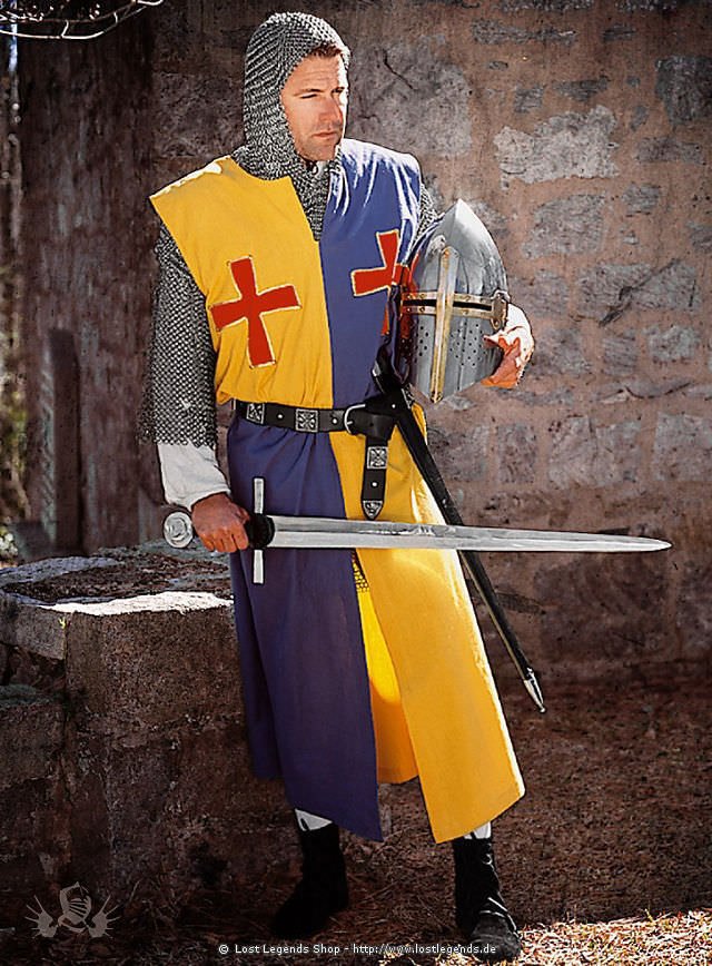 Wadenlanger Blau-gelber Wappenrock mit roten, goldumrandeten Kreuzen. Typisches Wappenkleid über der Kettenrüstung. Schlitze erleichtern das bequeme Gehen zu fuß oder Aufsteigen aufs Pferd.