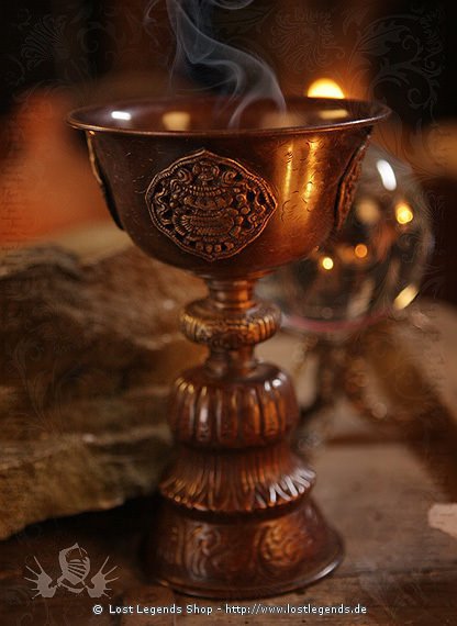 Räucherkelch aus patiniertem Kupfer, im tibetischen Stil ornamentiert.Höhe: ca. 18cmDurchmesser: ca. 12,5cm