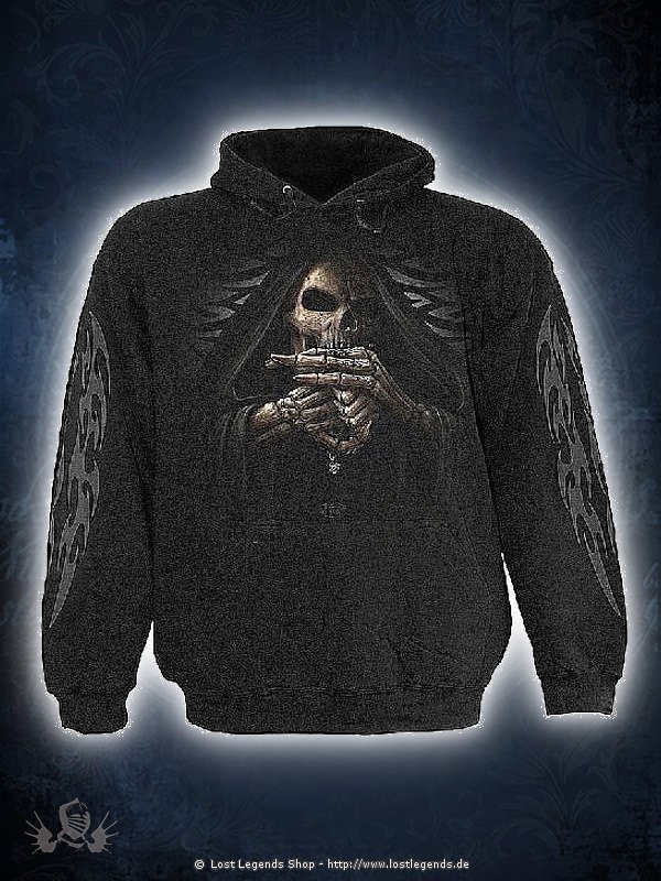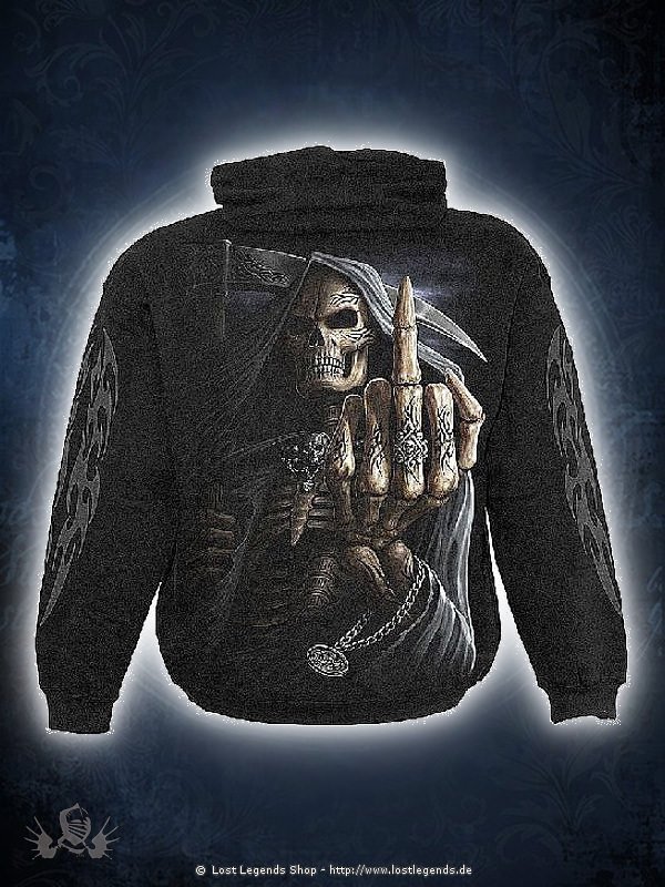 This Grim Reaper skeleton comes from out of the shadows with his tribal engraved middle bone finger raised in defiance. The back print shows the reaper cracking his bony knuckles.