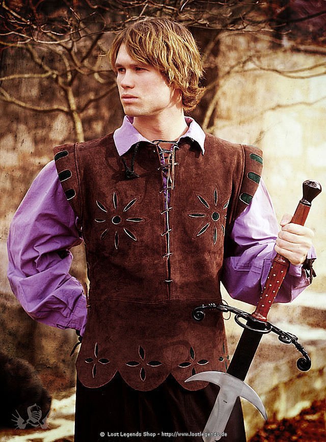 Dieses Wams aus echtem Wildleder schützt seinen Träger vortrefflich und kleidet ihn mit den ausgeschnittenen, grün unterlegten Symbolen auch ausgezeichnet. Auch die verstärkten Schulterwülste sind mit grünen Akzenten versehen. Im Brustbereich und an den Seiten kann das Wams dank Schnürungen individuell an den Träger angepasst werden.
