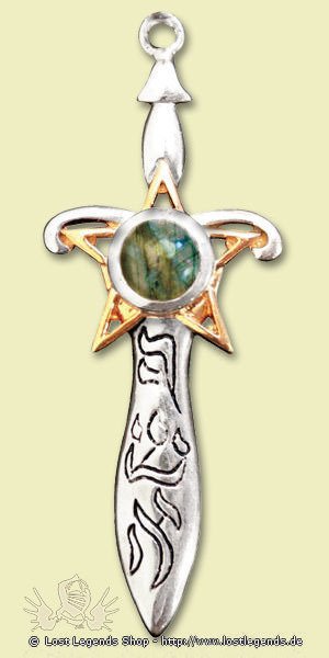 Labradorit: wird vom Schwert des Zauberers, Magiers und Astrologen Ashshaph getragen, eingefasst in ein Pentagramm, welches für magische Fähigkeiten steht.