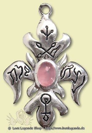 Rosenquarz: getragen von der Lilie, die mit alten hebräischen Liebes- und Siegesinschriften versehen ist und für Frieden und Liebe steht.