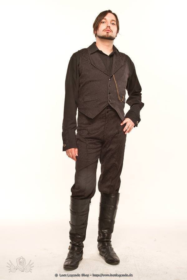 Amazing classic mens Steampunk Waistcoat made in luxurious raised floral patterned Brocade material with front press stud fastening, brass looped chain and two front placket pockets. Measuring 58.5cm in length. Fabulous Steampunk Waistcoat top.