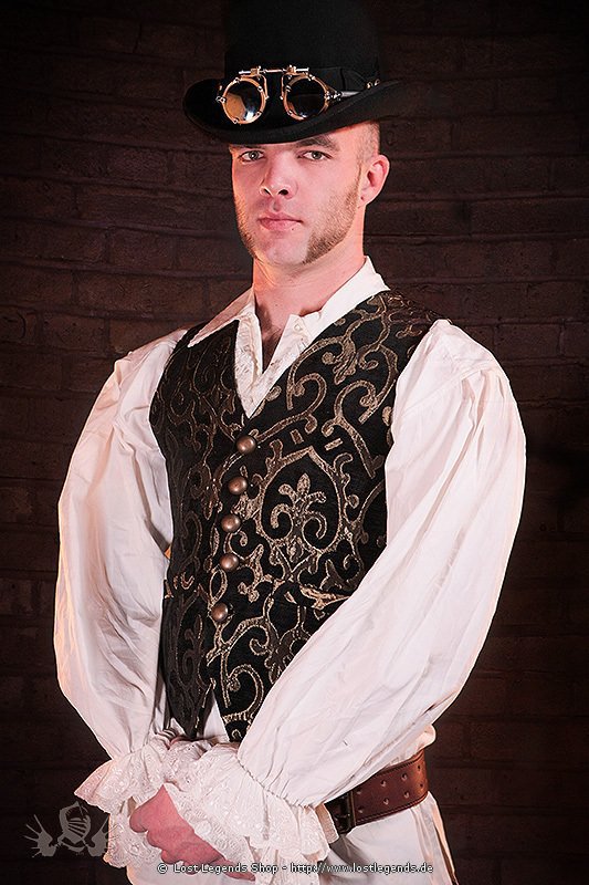 Schicke Steampunk Veste aus Brokat mit aufwendigen Verzierungen, kleinen Taschen und Knöpfen vorne.