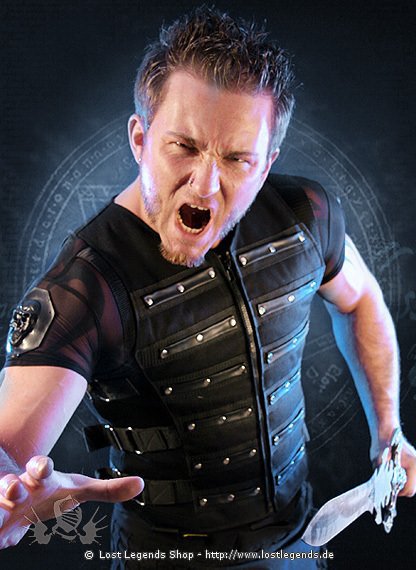 Gefütterte Weste aus festem Denim mit aufgenähten Gurtbändern und Kunstleder. Seitlich mit elastischem Einsatz und Schnallen.