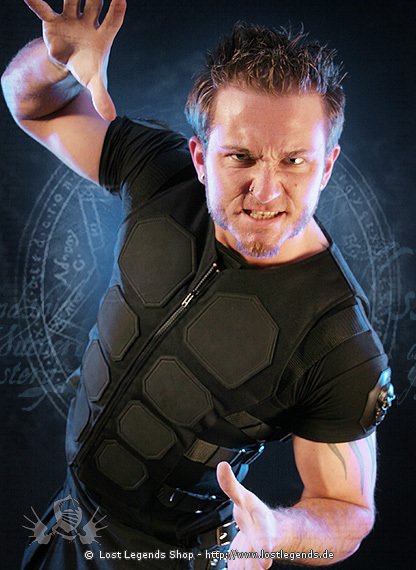 Gefütterte Weste aus festem Denim mit aufgenähten Gummipads. Seitlich mit elastischem Einsatz und Schnallen.