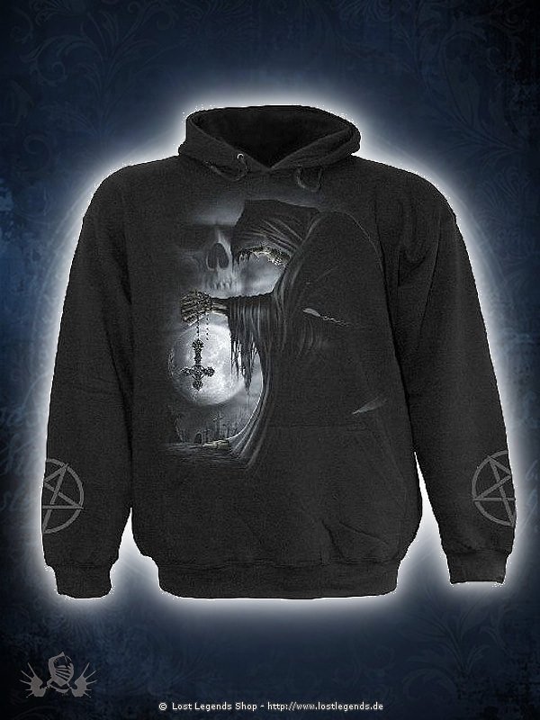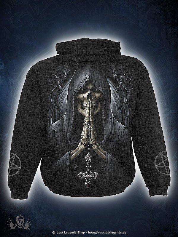 The grim reaper, death himself stands in a church doorway clasping his Gothic rosary