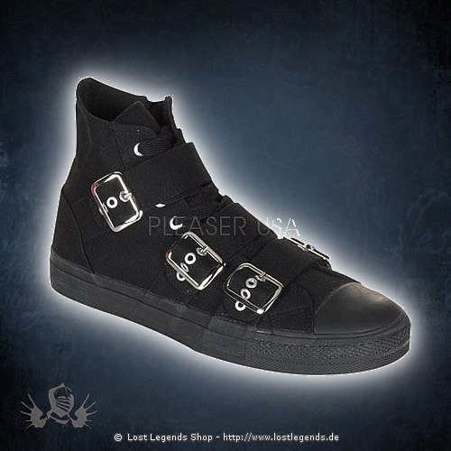 Punk Goth Skater Canvas 3 Buckle Strap High Top Sneaker in der Farbe Schwarz.
