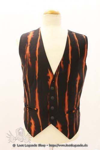 Mens New Alt collarless waistcoat made from an edgy flame print Cotton. Perfect for creating Alternative Punk outfits. Fastens down the front with four black press studs, features 2 jetted lined pockets and adjustable tape at the back. Pair with Empoium Trousers to complete the look.