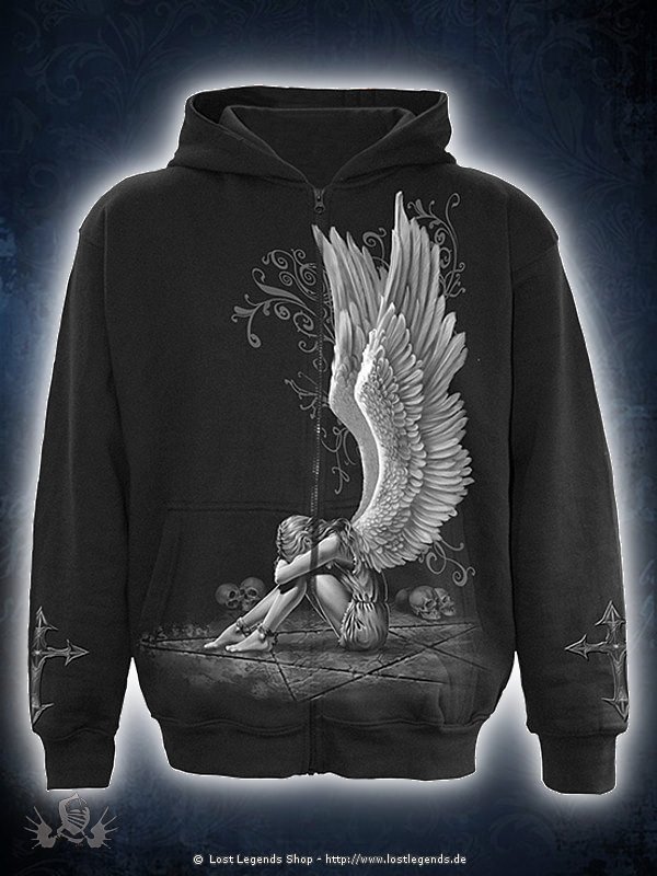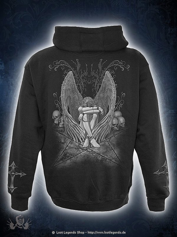 This chained, enslaved angel sits with her head hung in sorrow in the middle of a pentagram, surrounded by skulls of the dead.