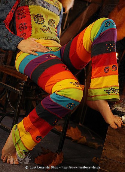 Wunderschönes gestreifte Hose im Ethnic Style aus reiner Baumwolle mit bunten Mustern und indischen Motiven. Jedes Teil wird handgefertigt und fällt daher von Farbe und Muster immer ein bisschen anders aus. Einheitsgrösse für Damengrössen von 36-38