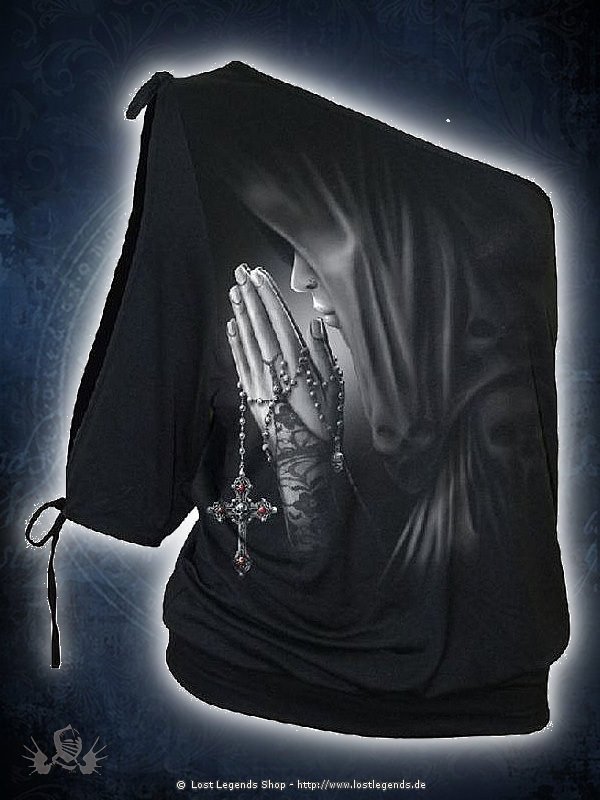 A cloaked woman prays clasping her rosary beads with a skull encrusted cross. The back print showing her entering the church in preparation for the exorcism.