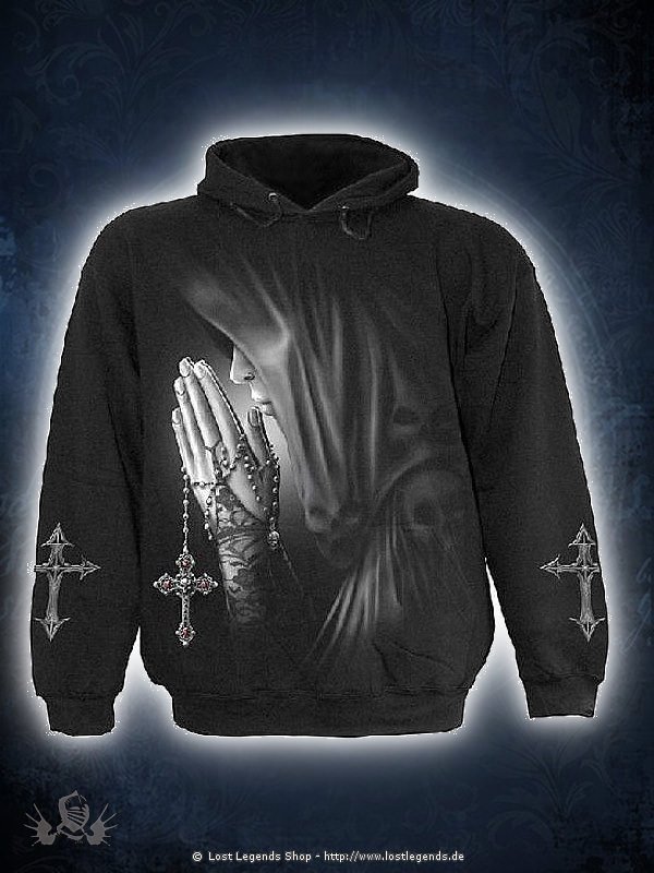 A cloaked woman prays clasping her rosary beads with a skull encrusted cross. The back print showing her entering the church in preparation for the exorcism.