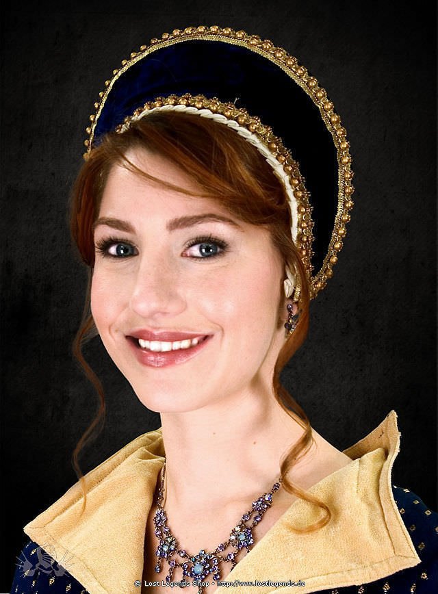 Diese Kopfbedeckung, auch als Tudorhaube bekannt, hat ihren Ursprung tatsächlich in Frankreich. Das samtige Blau dieser Französischen Haube wird von goldenen Borten umrahmt, die mit Kunstperlen besetzt sind und an der Unterseite durch Falbeln ergänzt werden. Die Französische Haube wird wie ein Haarreifen aufgesetzt und kann mit geflochtenen Bändern am Hinterkopf zusammengebunden werden.