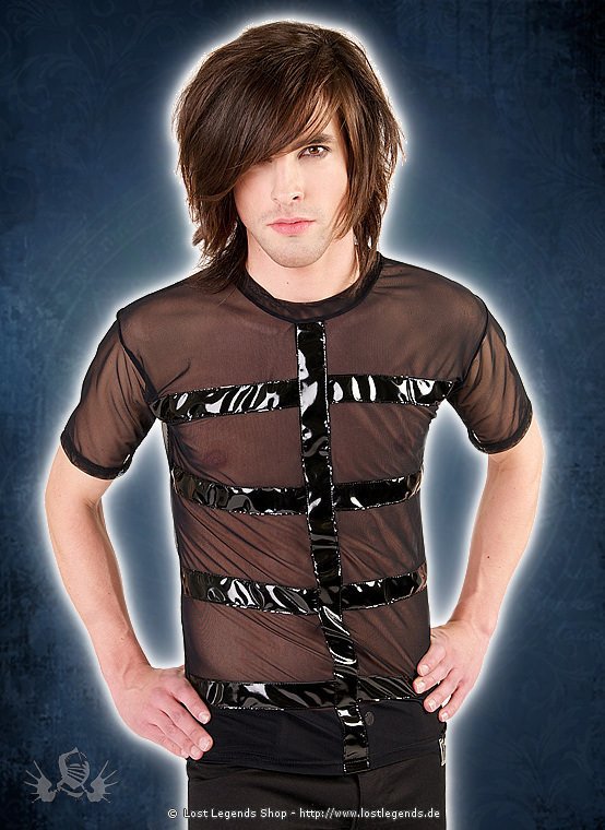 Dunkles Shirt aus schwarzem Chiffon mit eingenähten Lackstreifen