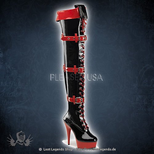 6″ Stiletto Plateau Overknee-Stiefel in der Farbe Schwarz-Rot.