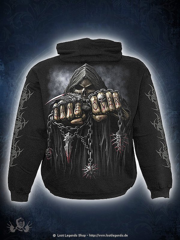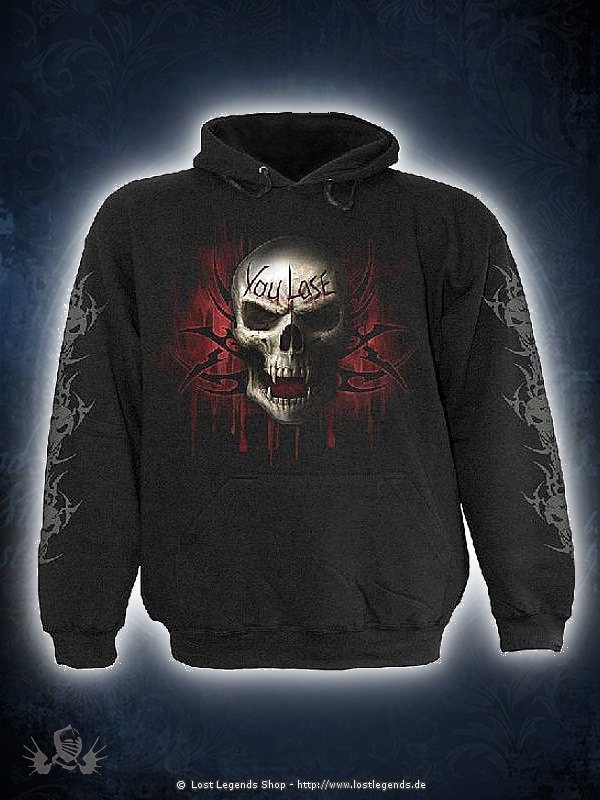 You know it is Game Over if you see this skeleton Reaper with his carved knuckles. Tribal back print with You Lose carved in to the skull s forehead.