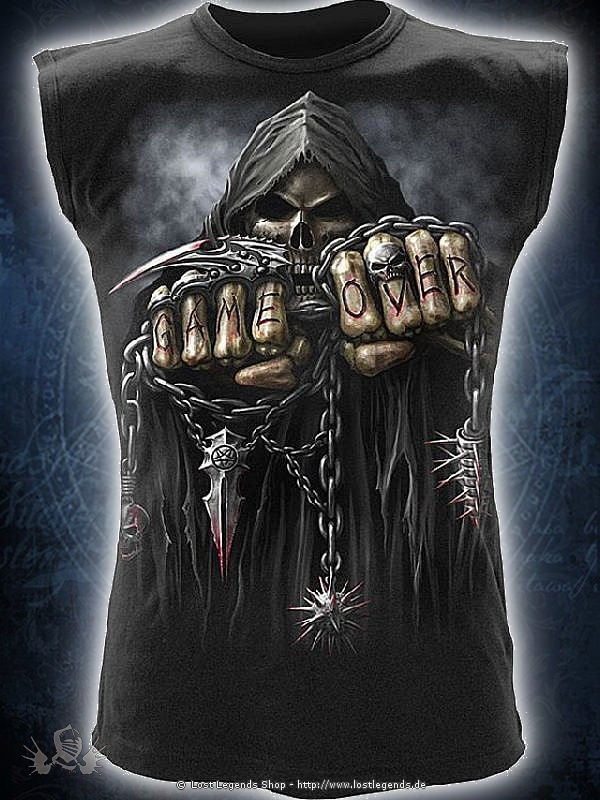 You know it is Game Over if you see this skeleton Reaper with his carved knuckles. Tribal back print with You Lose carved in to the skull s forehead.