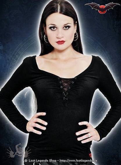 Ein Shirt, welches vor allem durch eine Schnürung am Dekolleté und den tiefen Rückenausschnitt besticht. Ganz raffiniert - ein feinmaschiges Netz unter der Kettenschnürung, welches keine voreiligen Einblicke gewährt!