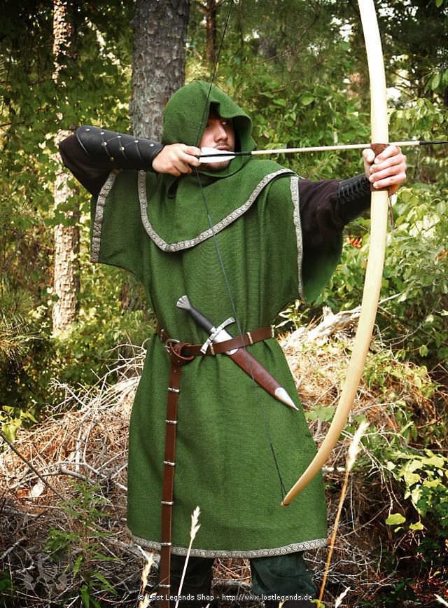 Diese Tunika und die gleichfarbige Gugel, die mit einem beige-braunen Saum geschmückt sind, bieten ausreichend Bewegungsfreiheit für Bogenschützen und Schwertkämpfer. Darüber hinaus ist diese Kombination aus sehr robusten Material gefertigt, denn sowohl die weite Tunika, als auch die Gugel sind aus Baumwolle in verschiedenen Grüntönen gewebt. Dadurch ist der Grad der Tarnung in Wäldern besonders wirkungsvoll.