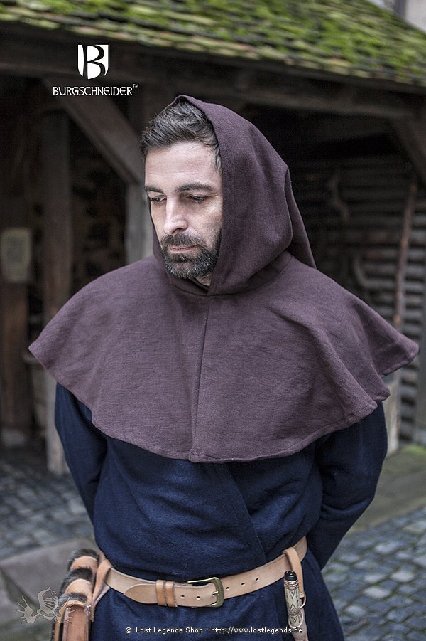 Die Gugel darf in keinem mittelalterlichen Alltagsgewand fehlen! Die hochmittelalterliche Gugel Capellus ist mit einer kurzen Sendelbinde, also einem kurzen Zipfel geschnitten, und wurde in dieser praktischen Form von Bauern, Jägern, Reisenden und einfachem Volk getragen. Sie bot perfekten Schutz vor Wind und Wetter. Diese Gugel wird vorne geschlossen und hat durch die grobe ungekämmte Baumwolle ein authentischen Look, und ist robust zugleich, jedoch nicht zu dick.