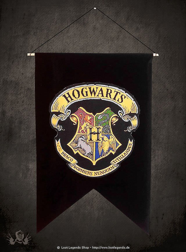 Das Hogwarts Banner ist dem Original aus den "Harry Potter"-Filmen nachempfunden und mit dem Schulmotto "Draco Dormiens Nunquam Titillandus" und dem Namen der Schule versehen. Im Zentrum des Schulbanners befindet sich das farbenfrohe Wappen, das die verschiedenen Wappen der vier Häuser Gryffindor, Ravenclaw, Hufflepuff und Slytherin zeigt. Das Banner selbst besteht aus einem weichen Fleece-Material in Schwarz. Es ist ca. 50 cm breit und ca. 76 cm hoch.