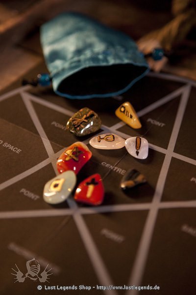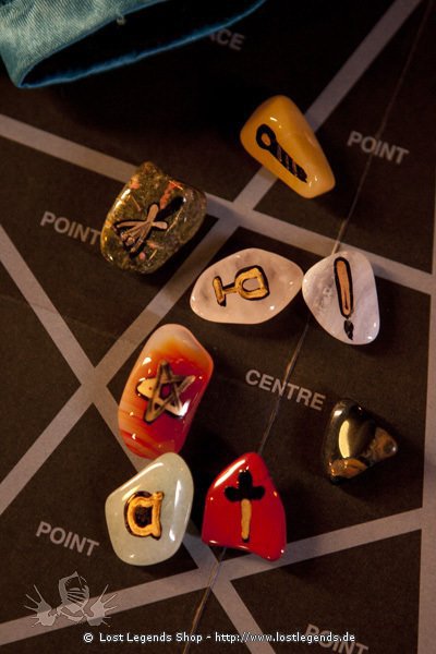 Eine Magische Quelle alten Wissens und Führung bestehend aus 8 Halbedelsteinen (roter und blauer Achat, Unakit, roter und gelber Jaspis, Aventurin, Rosenquarz und Tigerauge), die jeweils mit einem magischen Hexensymbol handbemalt sind, einem Pentagrammkreis zum Werfen der Steine und einem Faltblatt mit Anleitungen und Interpretationen.