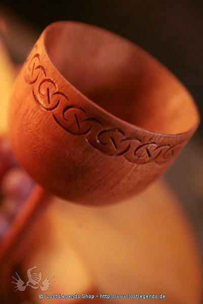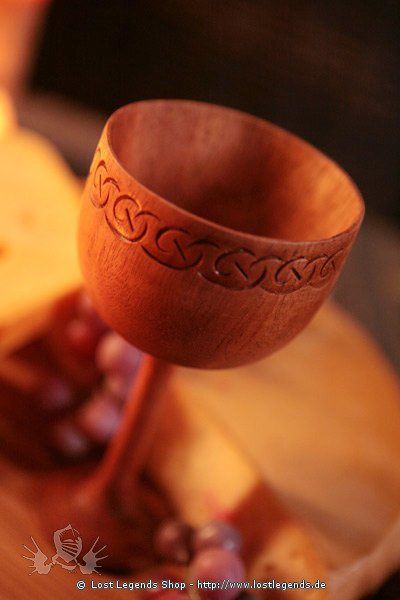 Handgearbeiteter Kelch aus Holz mit keltischen Schnitzereien.