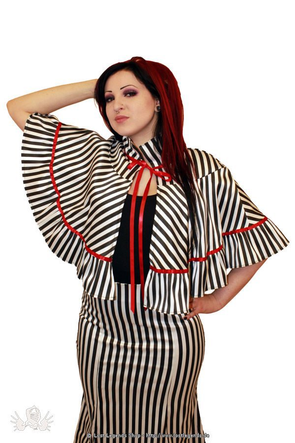 Victorian circus style, long shoulder cape which ties at the neck with ribbon. Striped material and red trim.