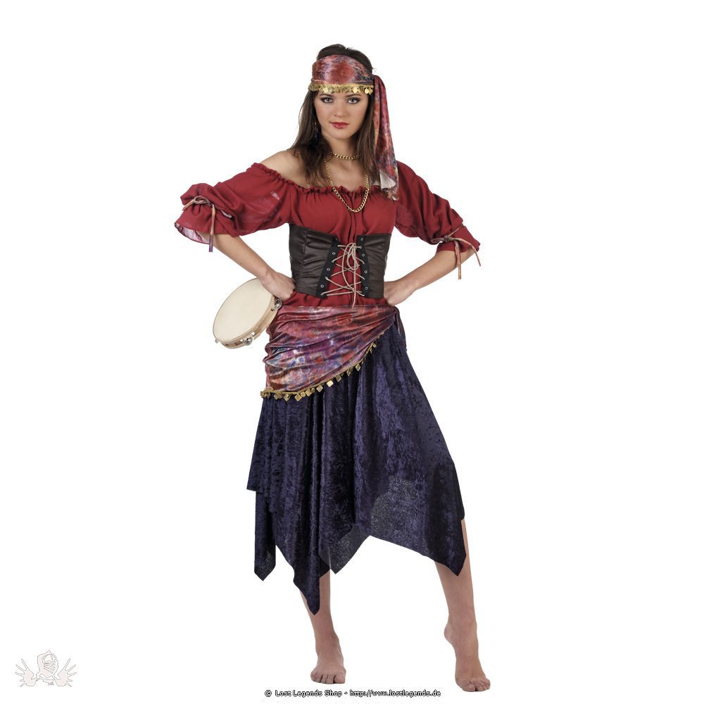 Dieses hübsche Kostüm ist inspiriert durch die Sinti und Roma. Mit Ihren tollen langen und wallenden Röcken sind sie bekannt für Tanz und gute Stimmung, was in der Regel natürlich auch an Karneval und Fasching nicht fehlen darf. Das Kostüm enthält alles, was zu einem guten Kostüm dazu gehört. Nicht nur der Rock und das Hemd sind inklusive, sondern auch die Scharpe um den Bauch, das Mieder und das Kopftuch. Mit diesem Outfit bist du bestens angezogen für ein ausgelassenes närrisches Feiern in der Karnevals/- und Faschingszeit.