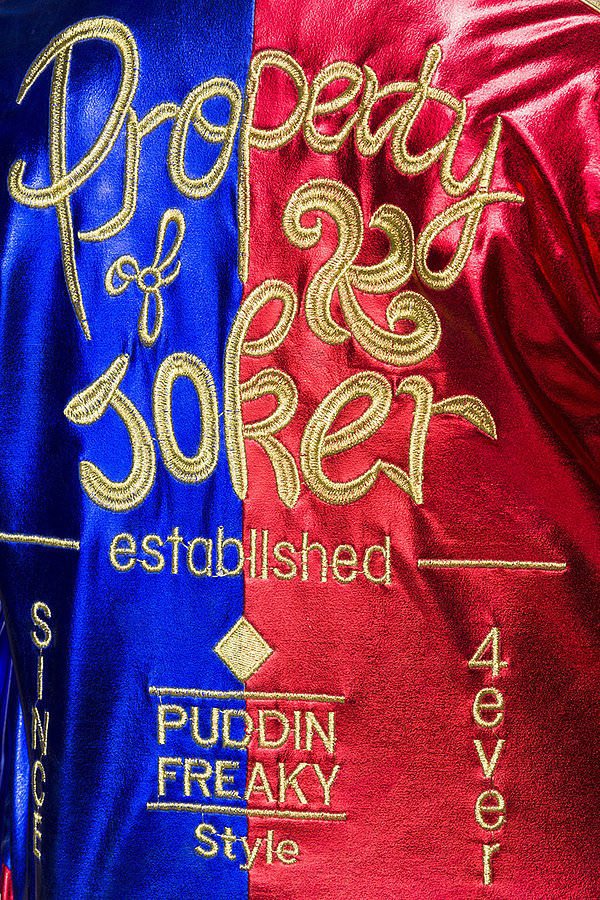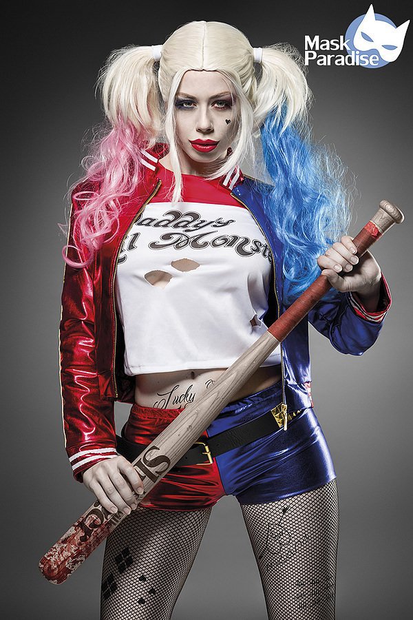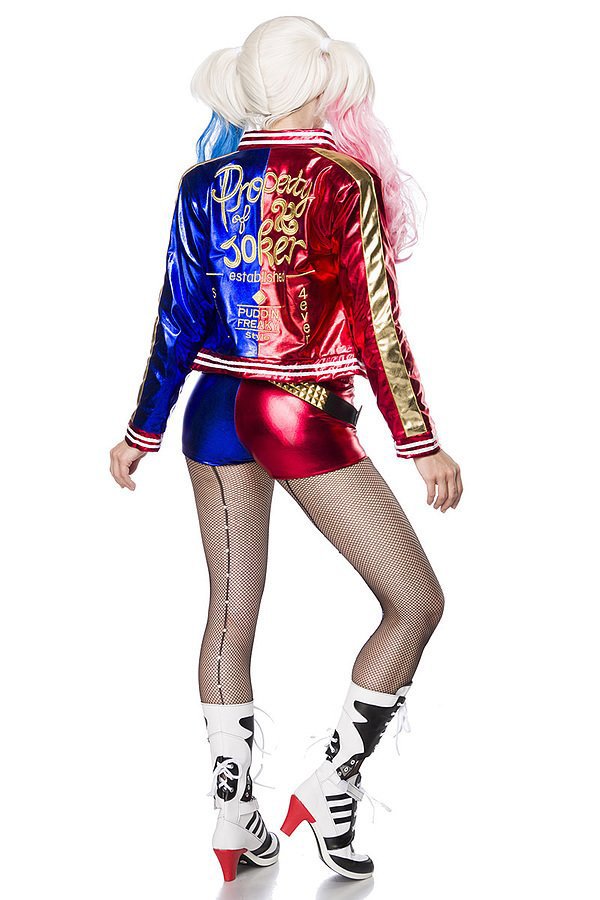 Bekannt aus dem Film "Suicide Squad" ist dieses Kostüm der Figur "Harley Quinn" bestehend aus gepolsterter und gefütterter Blouson Jacke im Metallik Look, mit goldfarbenen Applikationen im Rücken, Metallreißverschluss vorne und einem lässig geschittenen Longsleeve mit V-Ausschnitt, Rissen und Prints. Dazu wird die heisse zweifarbige Hotpants mit Gummizug geliefert, sowie eine Netzstrumpfhose mit Strass-Steinen und der goole Nietengürtel. Die passende Perücke ist separat im Shop unter der Kategorie Perücken erhältlich.