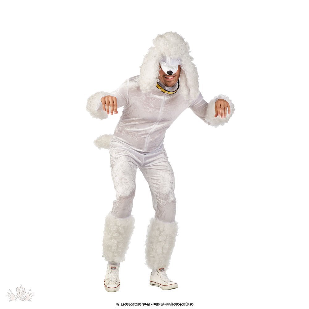 Der weiße Pudel kommt mit weißen Stulpen an Armen und Beinen und einer weißen Pudelmütze. Damit der Pudel sein Herrchen nicht verliert gibts natürlich auch ein passendes Halsband.