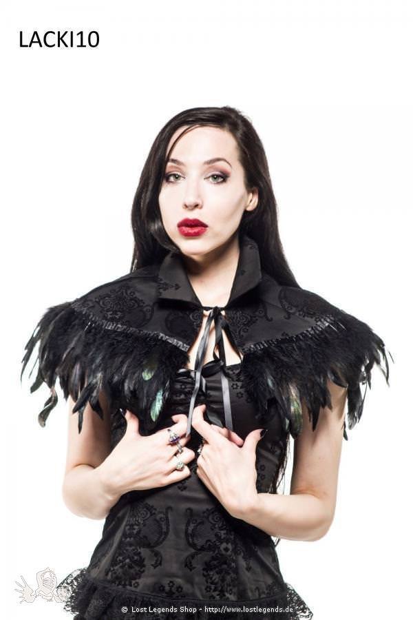 From the new Kiara range this ladies black shoulder cape is made in the luxurious Kiara fabric which is a lovely flock design. It is trimmed with stunning black and green tinted feathers. Fastens at the neck with a satin ribbon tie.