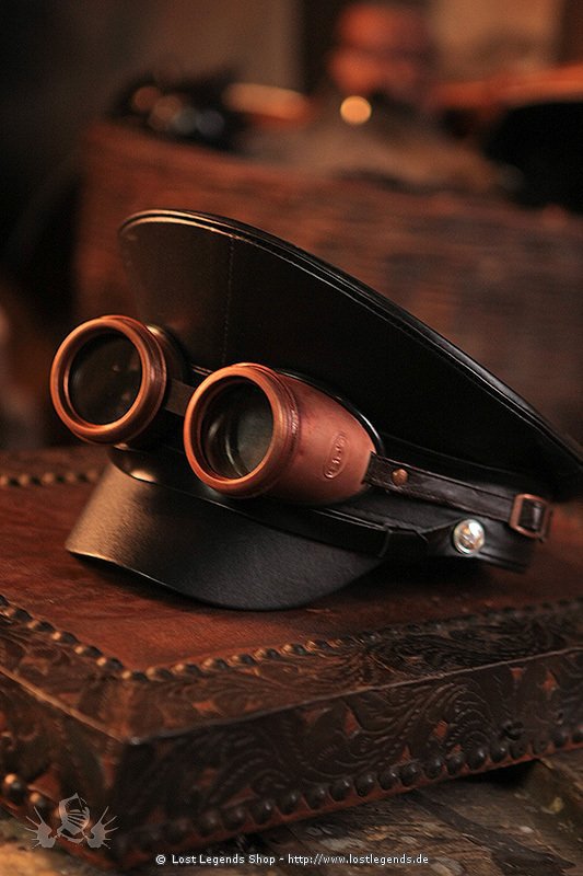 Steampunk Offiziermütze aus Kunstleder mit Kupfernen Zahnrädern verziert sowie einem Steampunk-Goggle.
