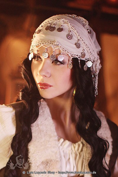 Kopftuch mit Münzen. Auch als Schal oder um die Hüfte tragbar wertet dieses Accessoire jede Gewandung vielseitig auf.