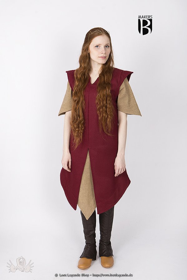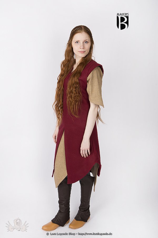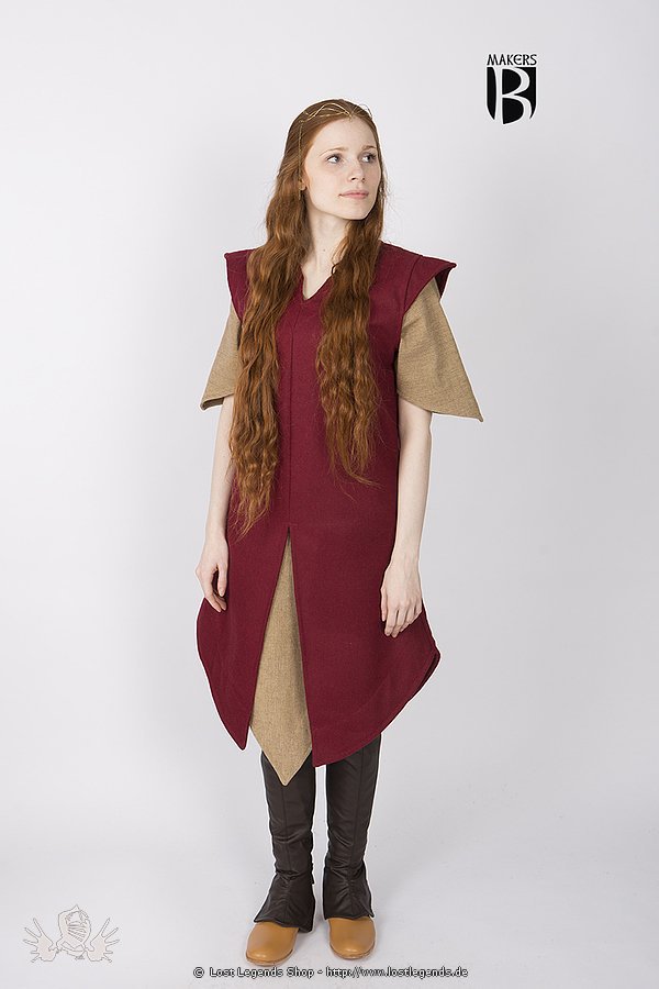 Mittelalterliche Tunika aus dickem Wollgemisch, vorne gespalten und seitlich schräg hochlaufen. Diese Tunika sticht durch ihren aussergewöhnlichen Schnitt elegant aus der Masser heraus und kann prima kombiniert werden. Beliebt ist Sie auch im Fantasy und LARP Bereich. Auch als Übertunika über einer halb/langarm Tunika.