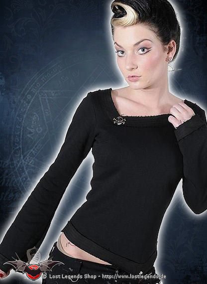 Ein schlichter schwarzer Rundhalspullover mit Trompetenärmeln u. einem kleinem Metalltotenkopf am Dekoltee.