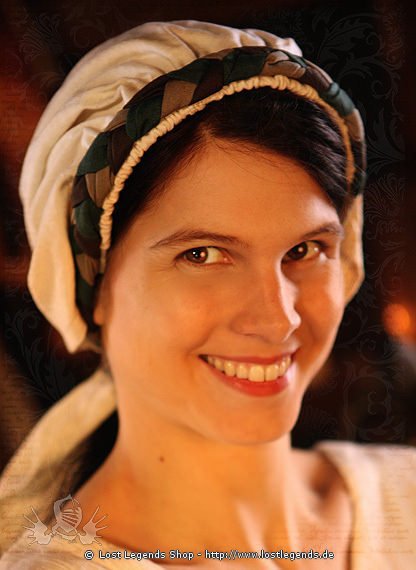 Mittelalterliche Haube aus naturfarbener Baumwolle mit geflochtenem Haarband in verschiedenen Grün- oder Rotfarbtönen.