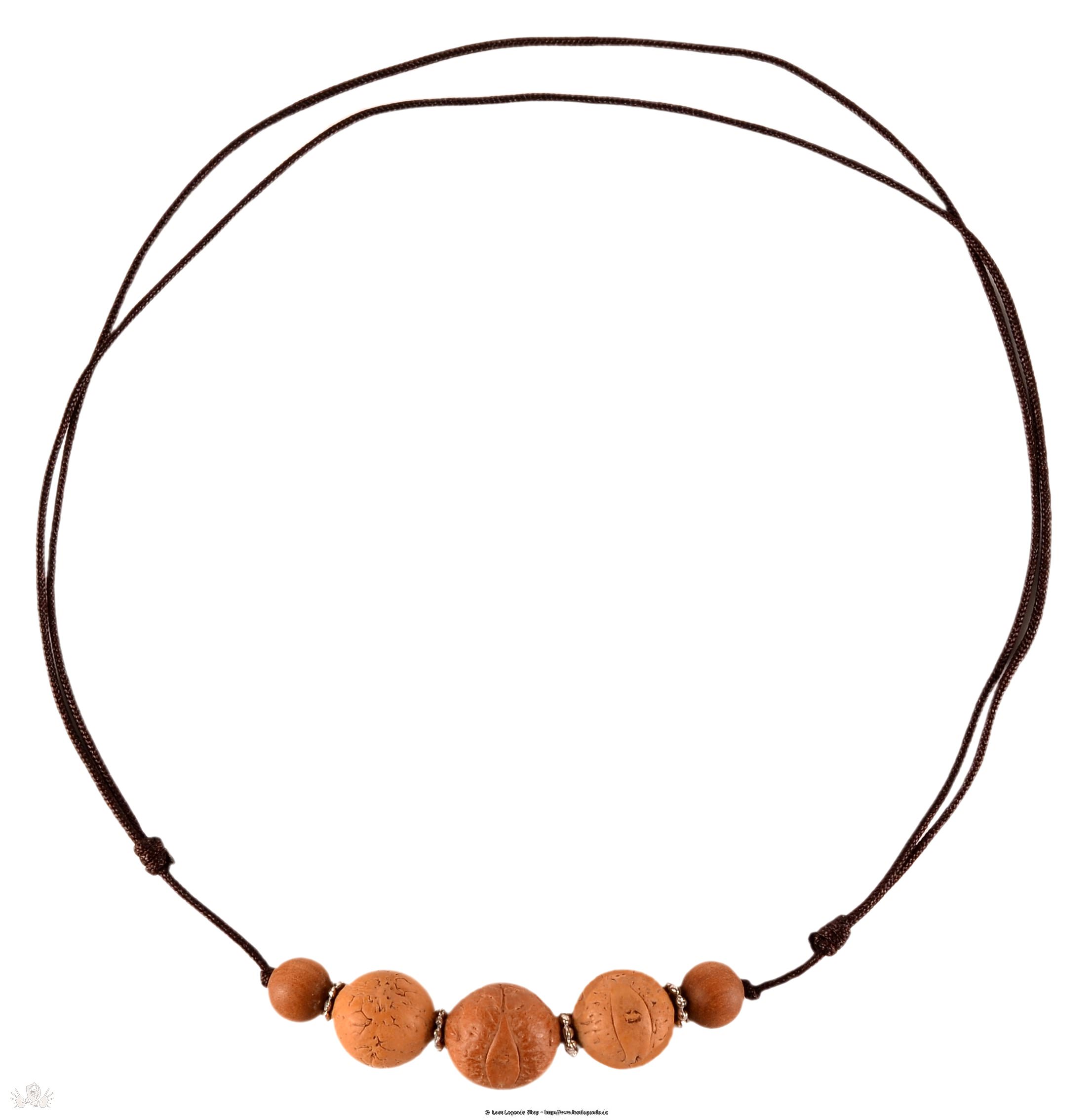 Halskette mit fünf Perlen konisch zulaufend in verschiedenen Größen zwischen jeder Holzperle ist jeweils ein kleines silberfarbenes Metallornament gefasst.