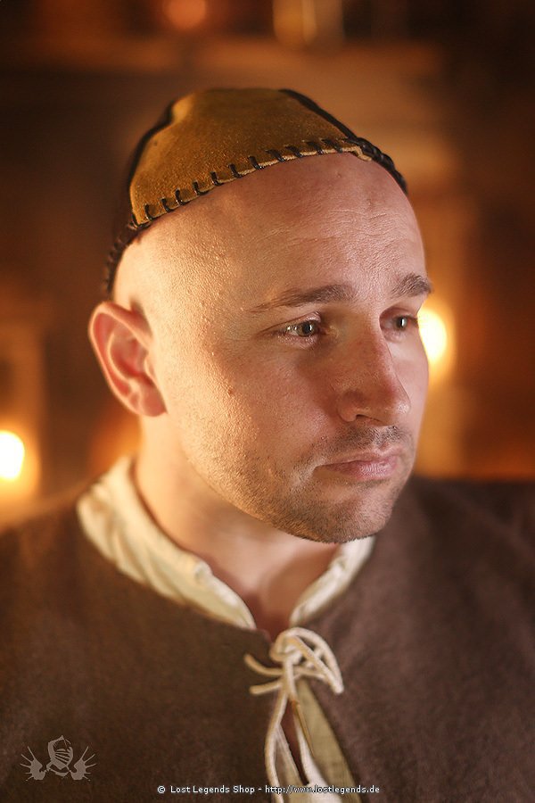 Handgearbeitete zweifarbige mittelalterliche Lederkappe aus Wildleder. Die mittelalterliche Kappe bietet Schutz vor Ungeziefer, Schmutz und Sonnenlicht und ziert den noblen Handelsmann ebenso wie den ehrenwerten Ritter in festlicher Manier!
