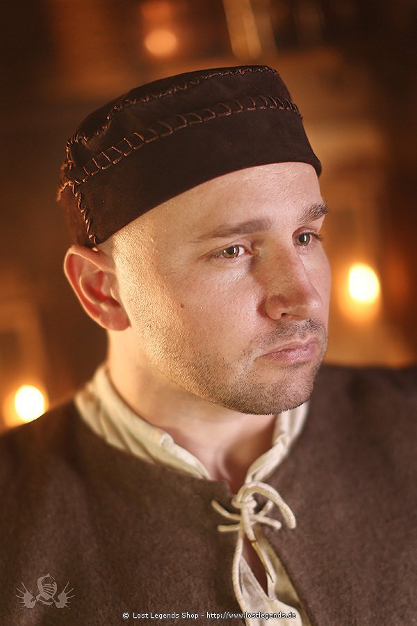 Handgearbeitete zylindrische Lederkappe aus dunkelbraunem Wildleder, am Saum von Hand aufwendig mit Schlingenstichen eingefasst. Die mittelalterliche Kappe bietet ordentlichen Knappen, Bauern, einfachen Gefolgsleuten aber auch noblen Händlern, Handwerkern und anderen Bürgern Schutz vor Ungeziefer, Schmutz und Sonnenlicht. Auch der edle Ritter greift gern auf sie zurück, wenn er gerade die Rüstung nicht trägt. Diese kappe passt einfach perfekt zum mittelalterlichen Ambiente.