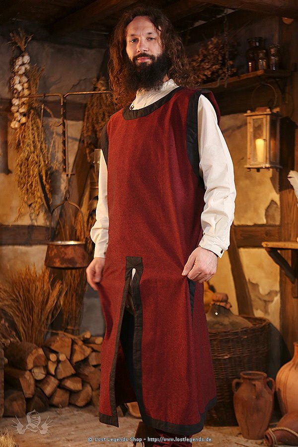 Dieser zweifarbiger Waffenrock ist ein ärmelloses Obergewand mit rundem Halsausschnitt und einer dekorativen schwarzen Bordüre. Der knielange Rock verfügt über vier Gehschlitze und erlaubt dadurch auch das Reiten zu Pferd. Das tragen des Waffenrocks über Kettenhemd oder Rüstung ist durch die Einheitgröße problemlos möglich.