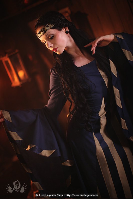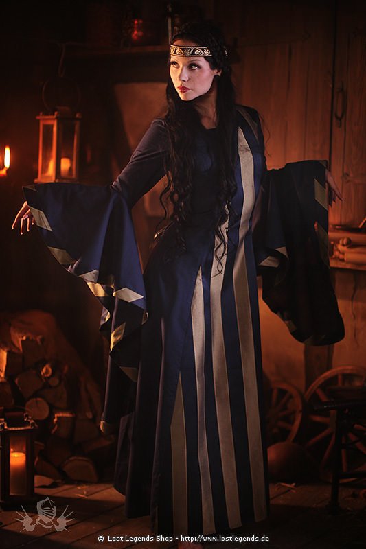 Edles Mittelalterkleid mit rechteckigem Ausschnitt und langen Trompetenärmeln, wobei die Form der Ärmel die eines Schildes nachahmt. Der Vordere Einsatz und die Ärmelenden sind mit einem gestreiften Stoff abgehoben. Das Kleid kann im Rücken durch eine Schnürung figurbetont tailliert werden.