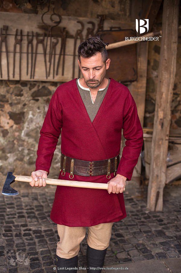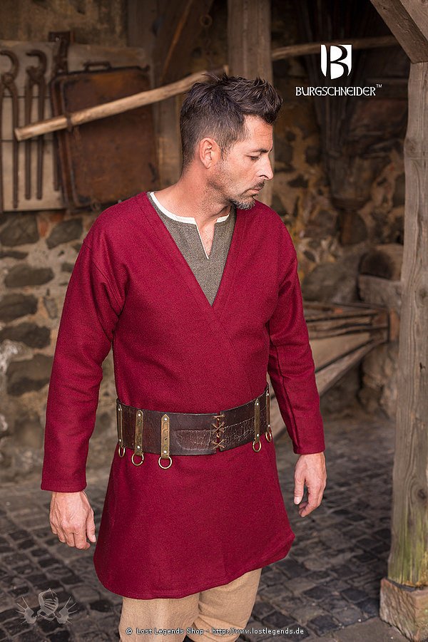 Mittelalterlicher Klappenrock aus dickem Wollgemisch mit langen Ärmeln, vorne offen und einfach übergeschlagen. Wird z.B. über über der Tunika getragen und hält warm ohne die Bewegunsfreiheit allzu sehr einzuschränken. Einfach an und auszuziehen.