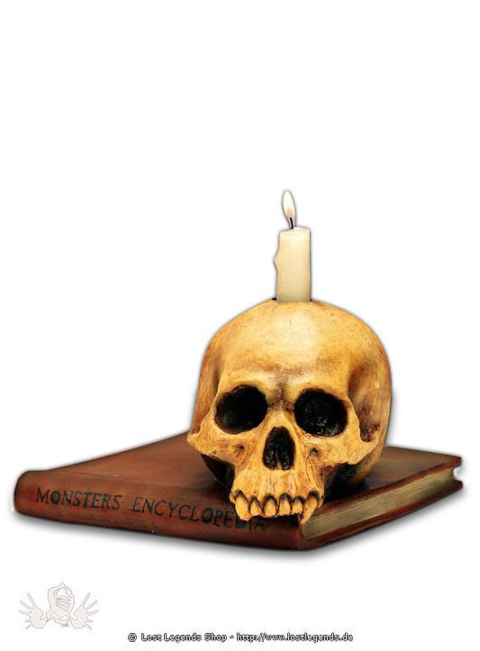 Mit Latex überzogene Schaumstoff-Dekoration der Monster Enzyklopädie mit Schädel als Kerzenständer. Maße ca. 26 x 27 x 26 cm.