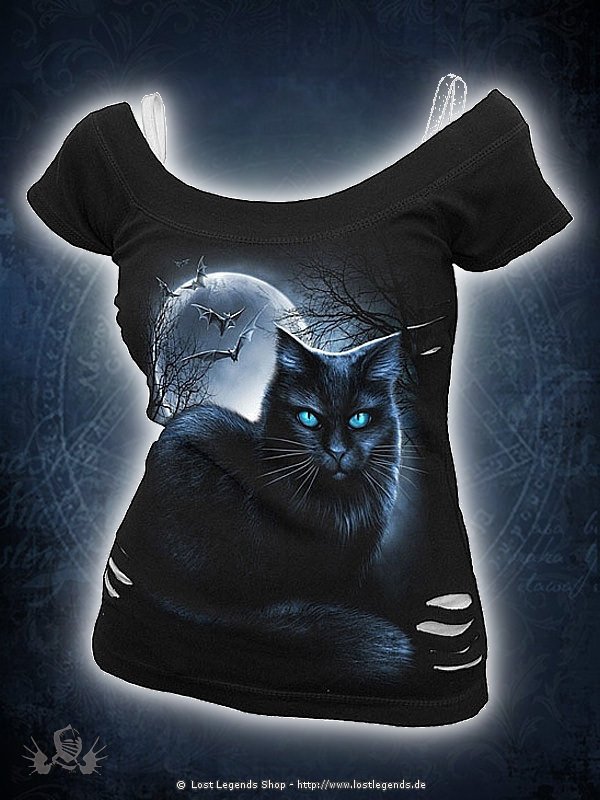 This jumbo print shows a cuddly black cat, calmly relaxing under the moonlit sky, unaware of the approaching bats.